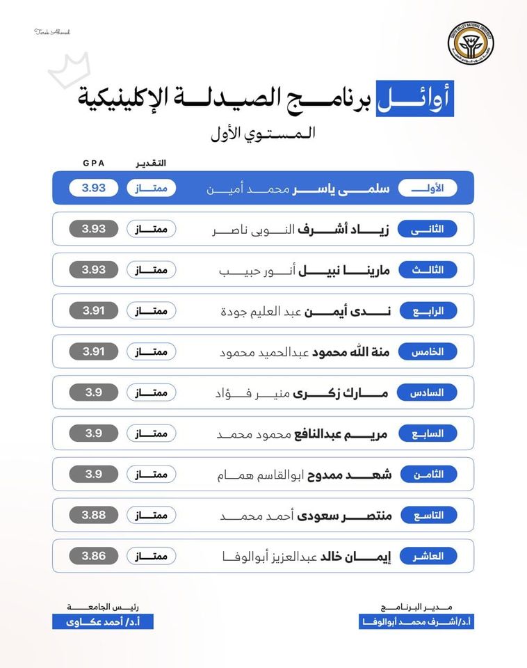 اعتمد الاستاذ الدكتور احمد عكاوي رئيس جامعة جنوب الوادي نتيجة الفرقة الاولي للفصل الدراسي الأول 2023-2024 برنامج الصيدلة الإكلينيكية لجامعة جنوب الوادي الأهلية و تتقدم جامعة جنوب الوادي الاهلية بأسمي ايات التبريكات والتهاني لابنائها الأوائل المتفوقين من برنامج الصيدلة الإكلينيكية وتتمنى لهم المزيد من التفوق والنجاح ويتقدم الأستاذ الدكتور اشرف محمد ابوالوفا مدير برنامج الصيدلة الإكلينيكية بالجامعة الأهلية بأطيب التهانى لجميع الطلاب والطالبات للنجاح والتفوق والطلبة المتوفقين هم الاول : سلمي ياسر محمد امين والثاني: زياد اشرف النوبي ناصر و الثالث : مارينا نبيل انور حبيب والرابع : ندي ايمن عبدالعليم جودة و الخامس:منه الله محمود عبدالحميد والسادس: مارك زكري منير فؤاد والسابع : مريم عبد النافع محمود والثامن : شهد ممدوح ابو القاسم و التاسع: منتصر سعودي احمد محمد و العاشر : ايمان خالد عبد العزيز ابو الوفا