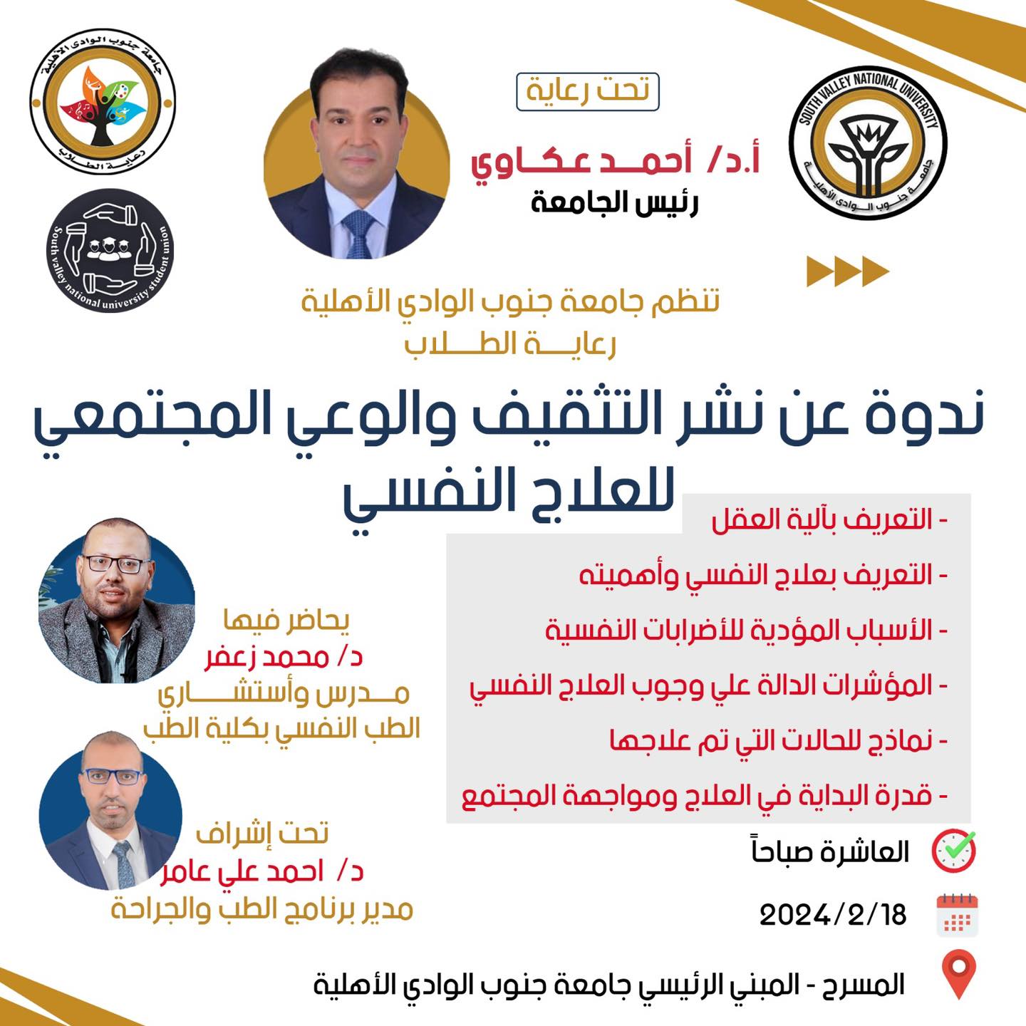 و تكون الندوة يوم الاحد الموافق ١٨/٢/٢٠٢٤ في الساعة العاشرة صباحا بمسرح الجامعة الاهلية بالمبني الرئيسي