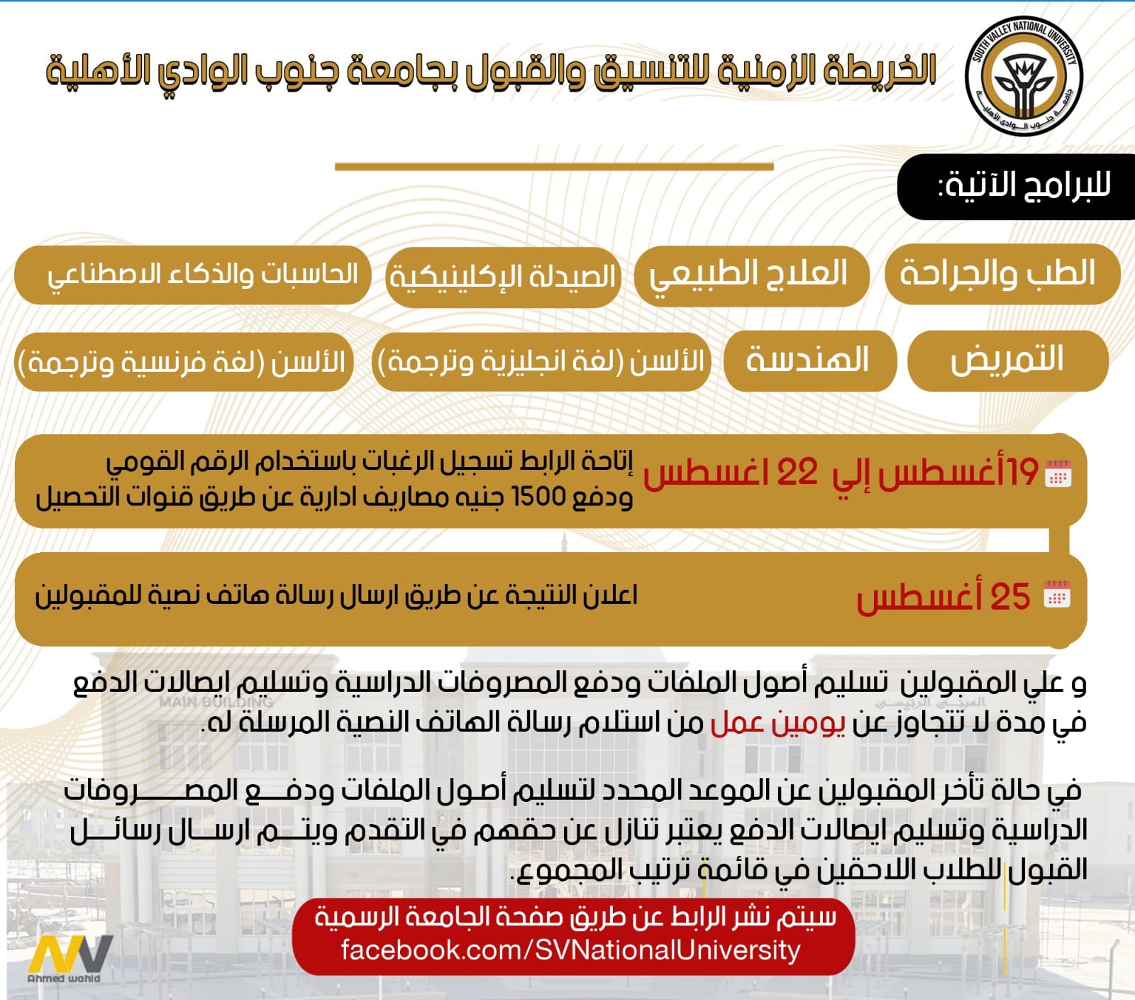 واستعرض رئيس الجامعة الخريطة الزمنية للتنسيق والقبول بالجامعة الاهلية وصرح انه سيتم فتح باب التقديم الكترونيا من خلال الرابط الذي سيتم اتاحته الاسبوع القادم لتسجيل الرغبات باستخدام الرقم القومي ودفع 1500 جنيه مصاريف ادارية عن طريق قنوات التحصيل اعتبارا من يوم الاثنين الموافق 19 اغسطس ويستمر التقديم حتى الخميس 22 اغسطس ثم يتم اعلان النتيجة يوم الاحد 25 اغسطس عن طريق ارسال رسالة هاتف نصية للمقبولين.