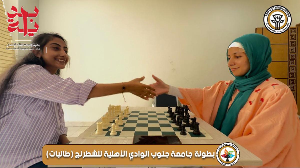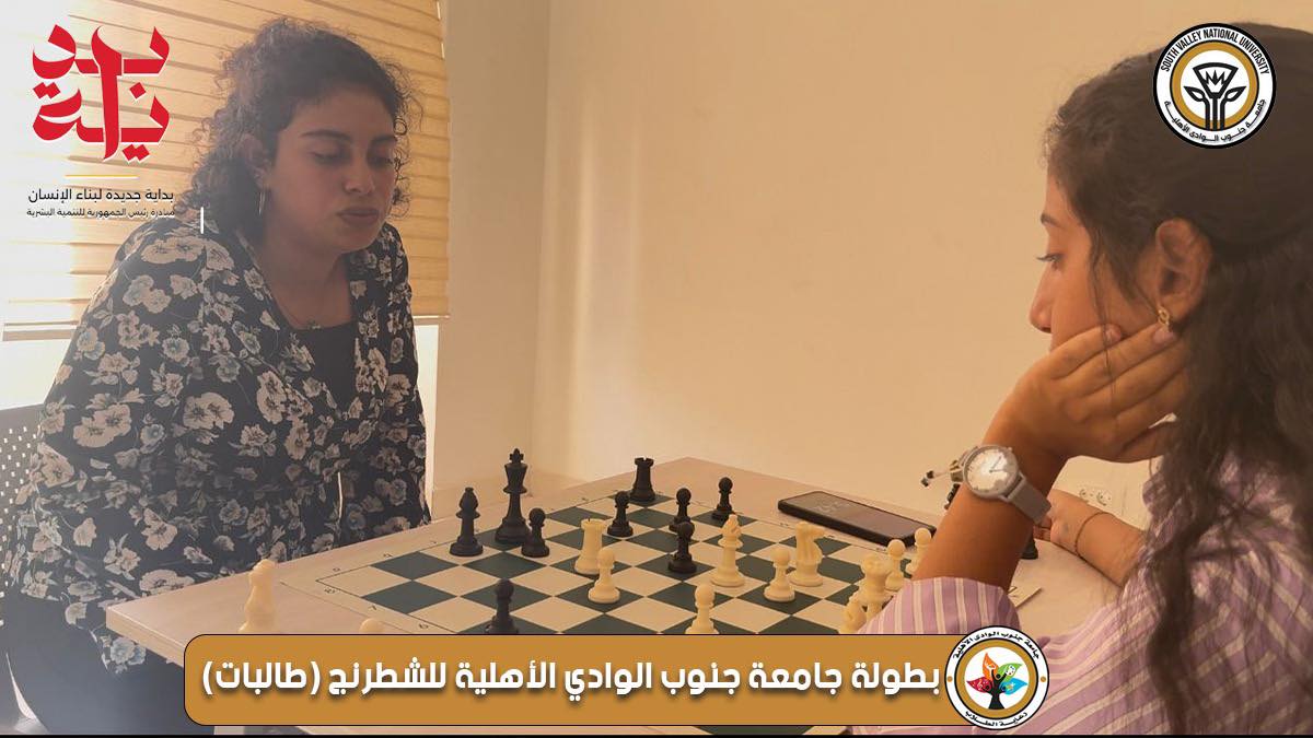 في اطار مبادرة السيد رئيس الجمهورية للتنمية البشرية "" بداية جديدة لبناء الانسان"" بناءً على تكليفات الرئيس عبد الفتاح السيسي، لتنفيذ برامج وأنشطة وخدمات متنوعة تشمل كل الفئات العمرية و تحت رعاية الدكتور احمد عكاوي رئيس الجامعة و الدكتور محمد اسماعيل النائب الاكاديمي اقامت ادارة رعاية الطلاب مسابقة الشطرنج للطالبات واسفرت نتيجة المسابقة عن الفائزات وجاء ترتيبهم كالاتي :-