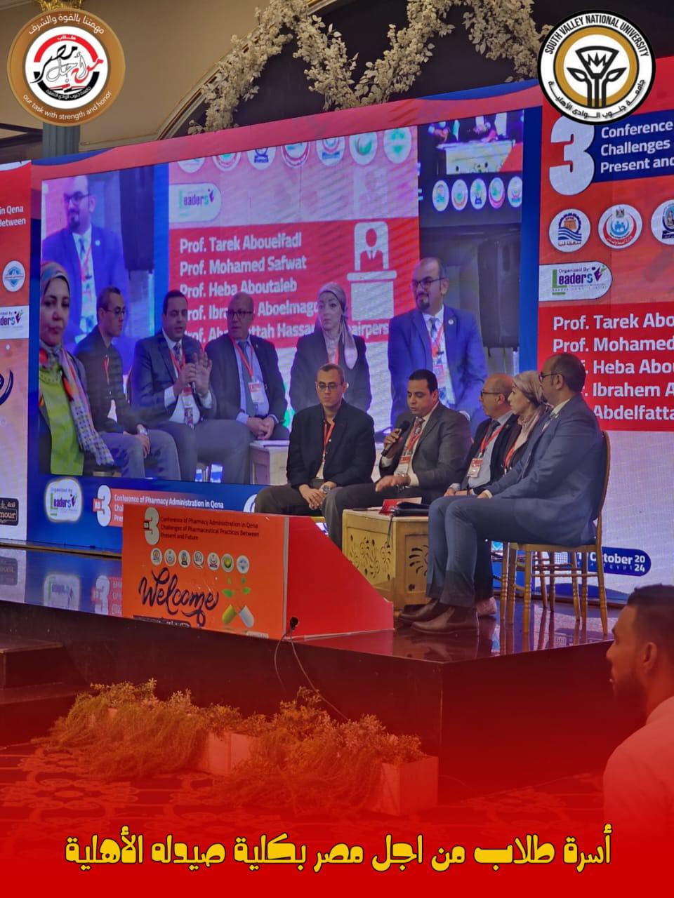 تحت رعاية الدكتور أحمد عكاوى رئيس جامعة جنوب الوادي و الدكتور محمد إسماعيل النائب الأكاديمى وإشراف الدكتور عبدالفتاح حسن مدير برنامج الصيدلة الإكلينيكية شاركت أسرة طلاب من أجل مصر فى تنظيم مؤتمر إدارة الصيدلة الثالث بعنوان "تحديات الممارسات الصيدلية بين الحاضر والمستقبل" والذي أقيم بقاعة لامور بقنا تحت رعاية الدكتور خالد عبدالحليم محافظ قنا والدكتور أحمد عكاوي رئيس الجامعة وبحضور عدد من قيادات الصحة ونقابة الصيادلة وهيئة الدواء وشهد المؤتمر حضور مميز من أعضاء هيئة التدريس بكليات الصيدلة بالجامعات المصرية وعدد غفير من الصيادلة ومن أهم الموضوعات التي ناقشها المؤتمر أهمية التغذية العلاجية وإعادة استخدام الأدوية المرخصة ومنظومة التأمين الصحي الشامل وأهمية الصحة النفسية وتعظيم دور الصيدلي في الفريق الطبي وتدريب امتياز الصيادلة وغيرها من الموضوعات الهامة.