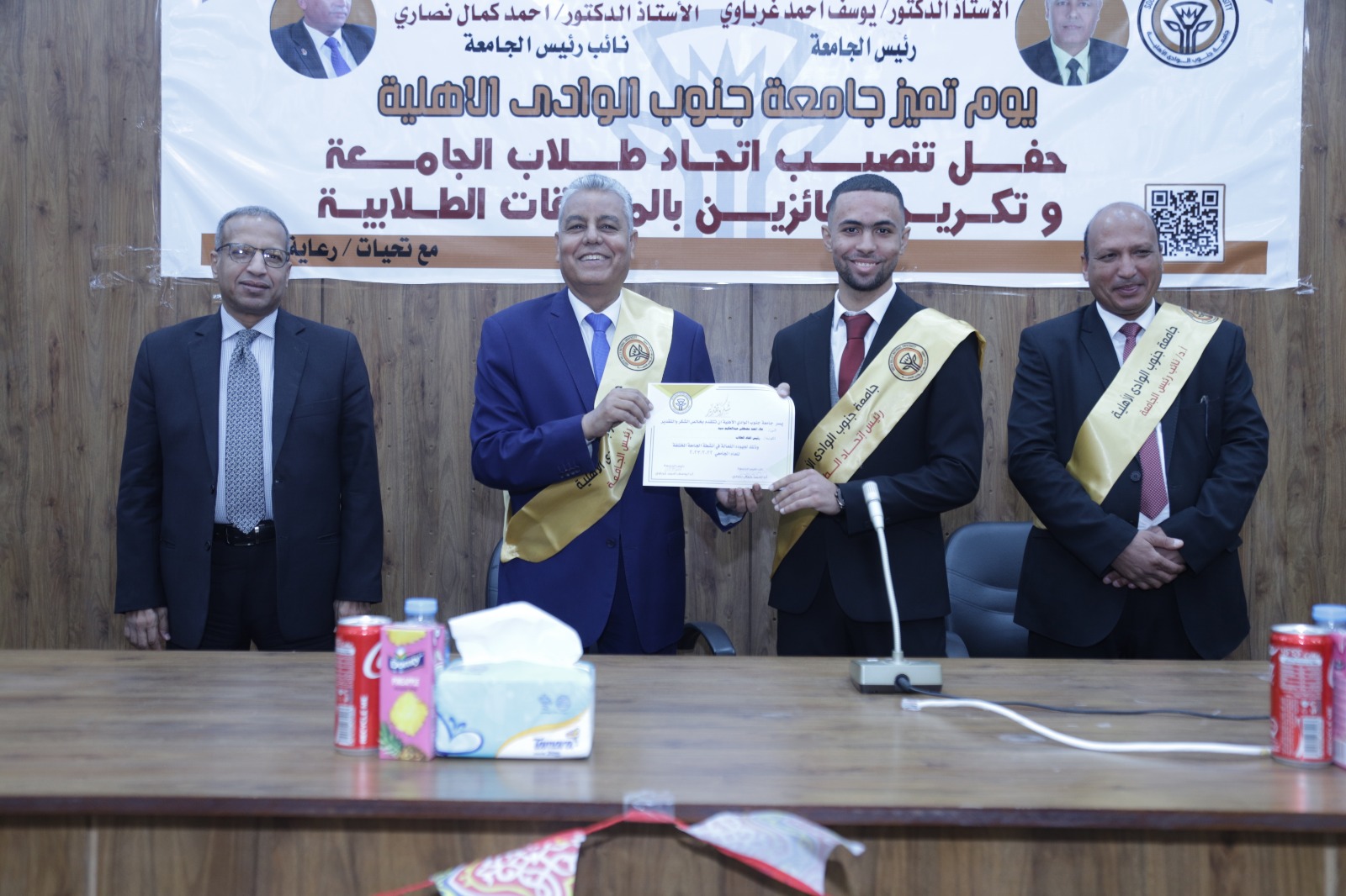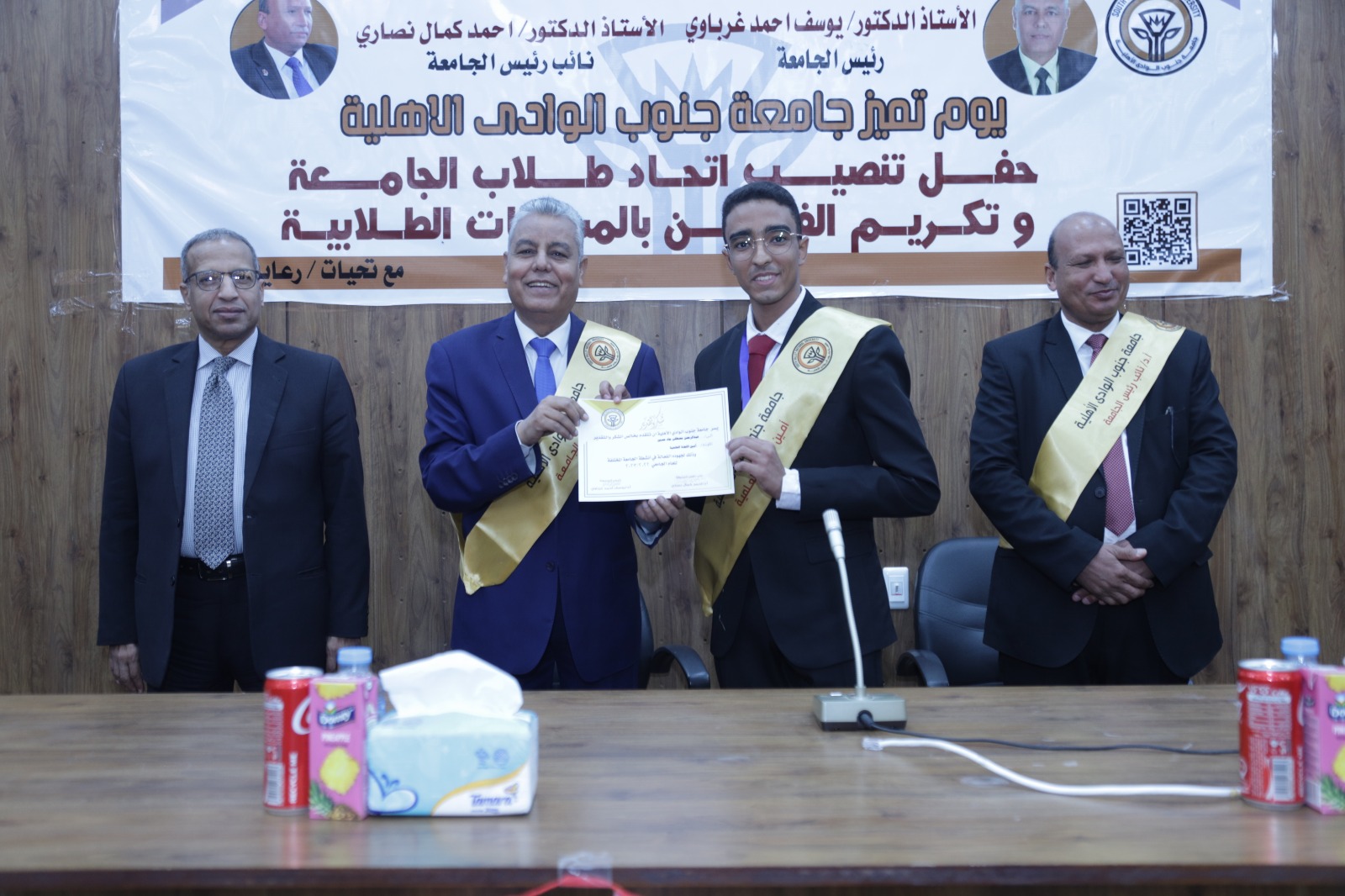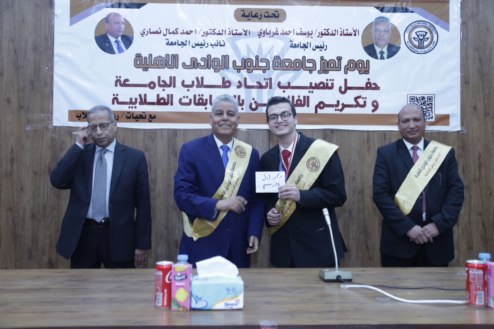 وقام الدكتور يوسف غرباوي رئيس جامعة جنوب الوادي والدكتور احمد كمال نصاري نائب رئيس الجامعة الأهلية الأكاديمي والدكتور بدوي شحات نائب رئيس الجامعة لشئون التعليم والطلاب بتنصيب اتحاد طلاب جامعة جنوب الوادي الأهلية وتكريم مديري البرامج والقائمين على الأنشطة بالجامعة الأهلية، ثم قام رئيس الجامعة ونواب رئيس الجامعة بتوزيع جوائز القائزين بالأنشطة الطلابية وهي مسابقة دوري المعلومات ومسابقة الرسم ومسابقة الشطرنج ومسابقة تنس الطاولة ومسابقة اللياقة البدنية وبطولية خماسيات كرة القدم، وشهد اللقاء وكان رئيس الجامعة ونواب رئيس الجامعة فى بداية اللقاء قد تفقدوا معرض فنى لطلاب الجامعة الاهلية ثم تم عرض فيلم توثيقي عن أنشطة رعاية الطلاب بجامعة جنوب الوادي الأهلية.