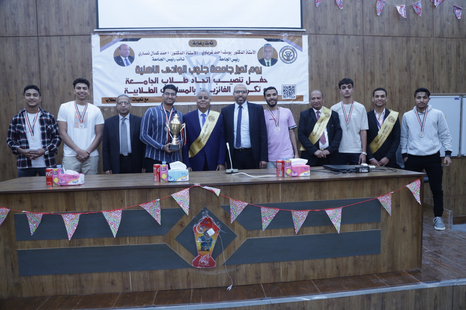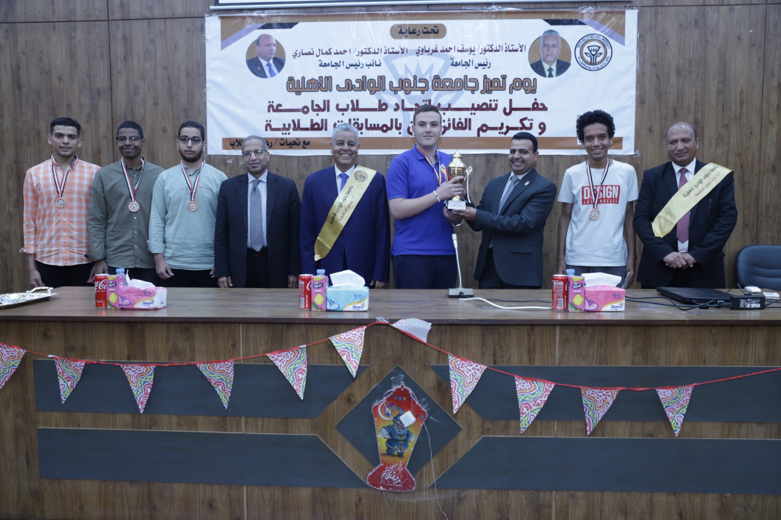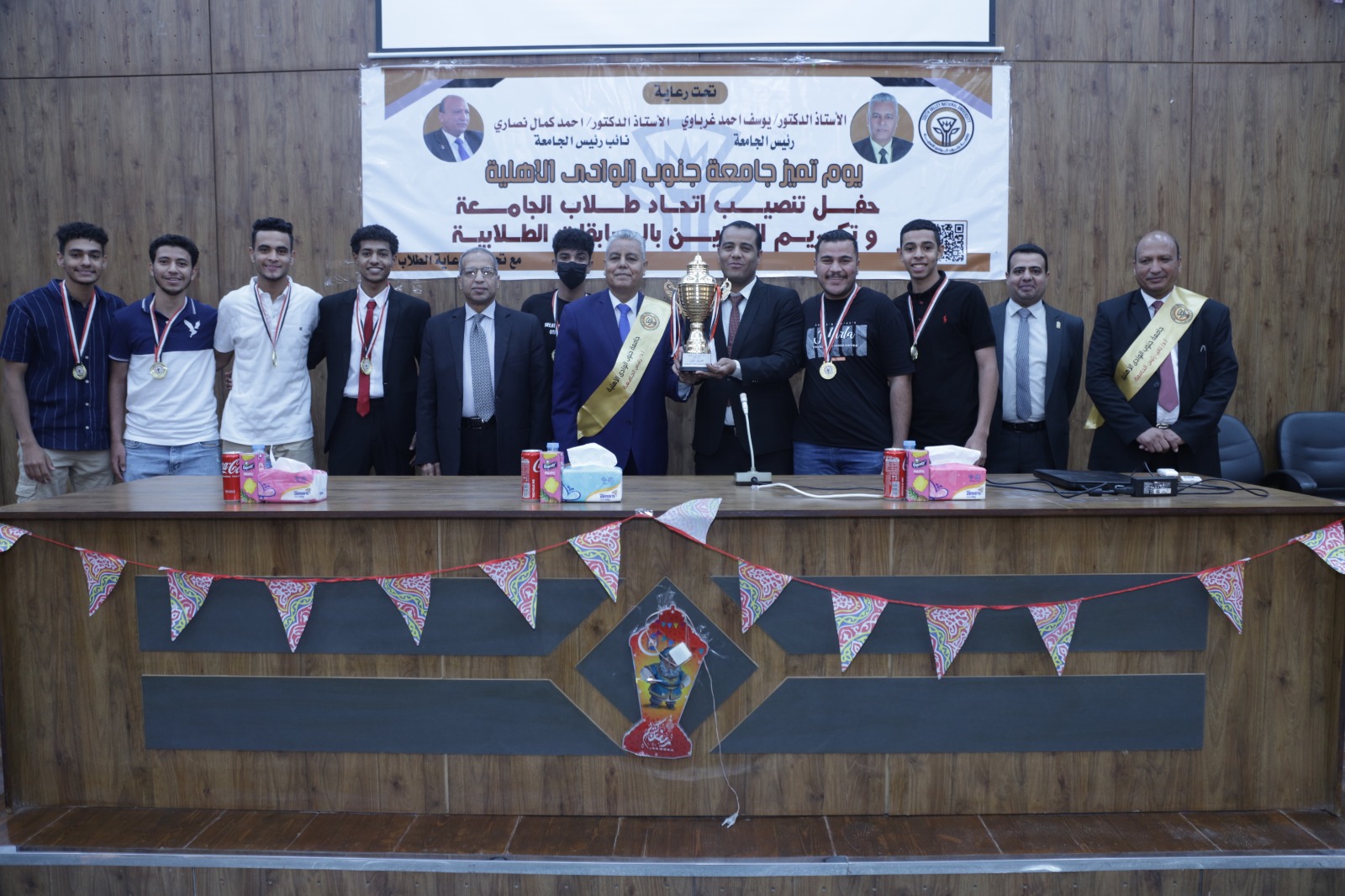 وقام الدكتور يوسف غرباوي رئيس جامعة جنوب الوادي والدكتور احمد كمال نصاري نائب رئيس الجامعة الأهلية الأكاديمي والدكتور بدوي شحات نائب رئيس الجامعة لشئون التعليم والطلاب بتنصيب اتحاد طلاب جامعة جنوب الوادي الأهلية وتكريم مديري البرامج والقائمين على الأنشطة بالجامعة الأهلية، ثم قام رئيس الجامعة ونواب رئيس الجامعة بتوزيع جوائز القائزين بالأنشطة الطلابية وهي مسابقة دوري المعلومات ومسابقة الرسم ومسابقة الشطرنج ومسابقة تنس الطاولة ومسابقة اللياقة البدنية وبطولية خماسيات كرة القدم، وشهد اللقاء وكان رئيس الجامعة ونواب رئيس الجامعة فى بداية اللقاء قد تفقدوا معرض فنى لطلاب الجامعة الاهلية ثم تم عرض فيلم توثيقي عن أنشطة رعاية الطلاب بجامعة جنوب الوادي الأهلية.