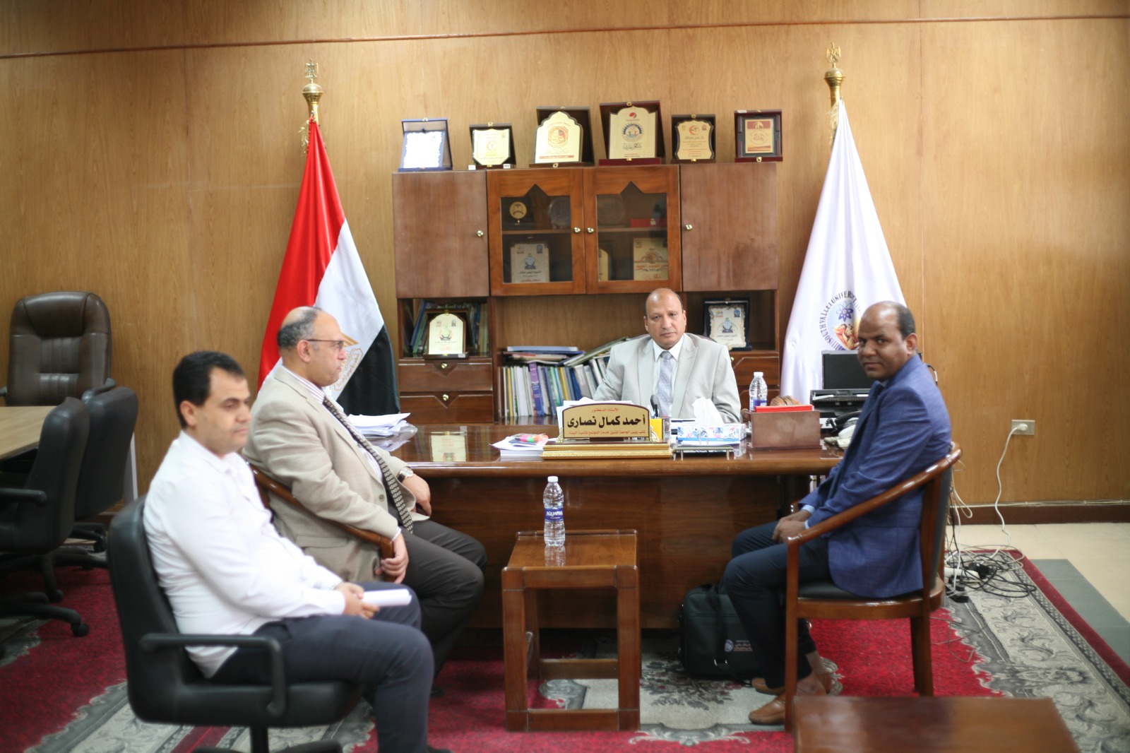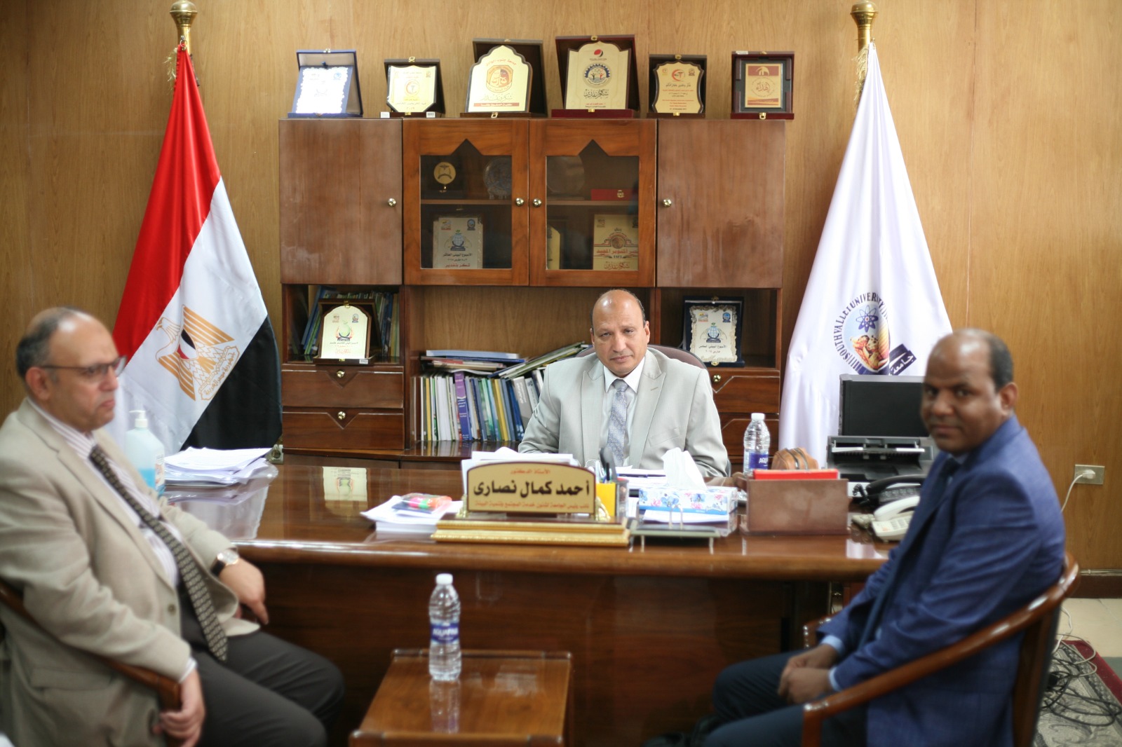 استقبل الدكتور يوسف غرباوي رئيس جامعة جنوب الوادي الدكتور اسامه هدهد - الأستاذ بكلية الهندسة جامعة القاهرة - عضو لجنة مراجعة لوائح الجامعات الاهليه بقطاع الدراسات الهندسيه لجامعة جنوب الوادي الأهلية بحضور الدكتور احمد عكاوى نائب رئيس الجامعة لشئون الدراسات العليا والبحوث والدكتور احمدكمال نصاري نائب رئيس الجامعة لشئون خدمة المجتمع وتنمية البيئة والدكتور عرفه محمود المستشار الهندسى للجامعة والدكتور عبدالرحيم يوسف الاستاذ المساعد بقسم الهندسة الكهربائية بكلية الهندسة بقنا.