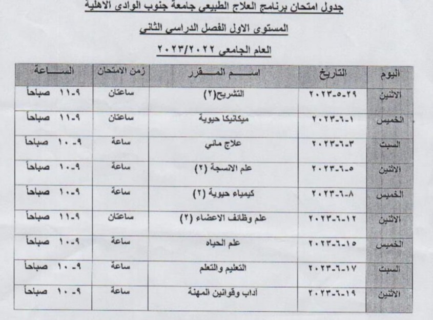 جدول الامتحانات النظرية ببرنامج العلاج الطبيعي