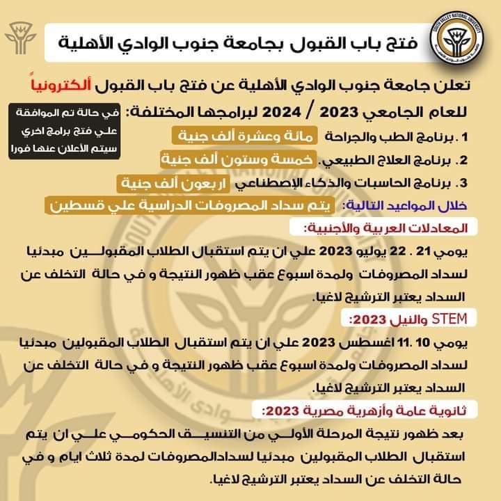 فتح باب القبول بجامعة جنوب الوادي الأهلية