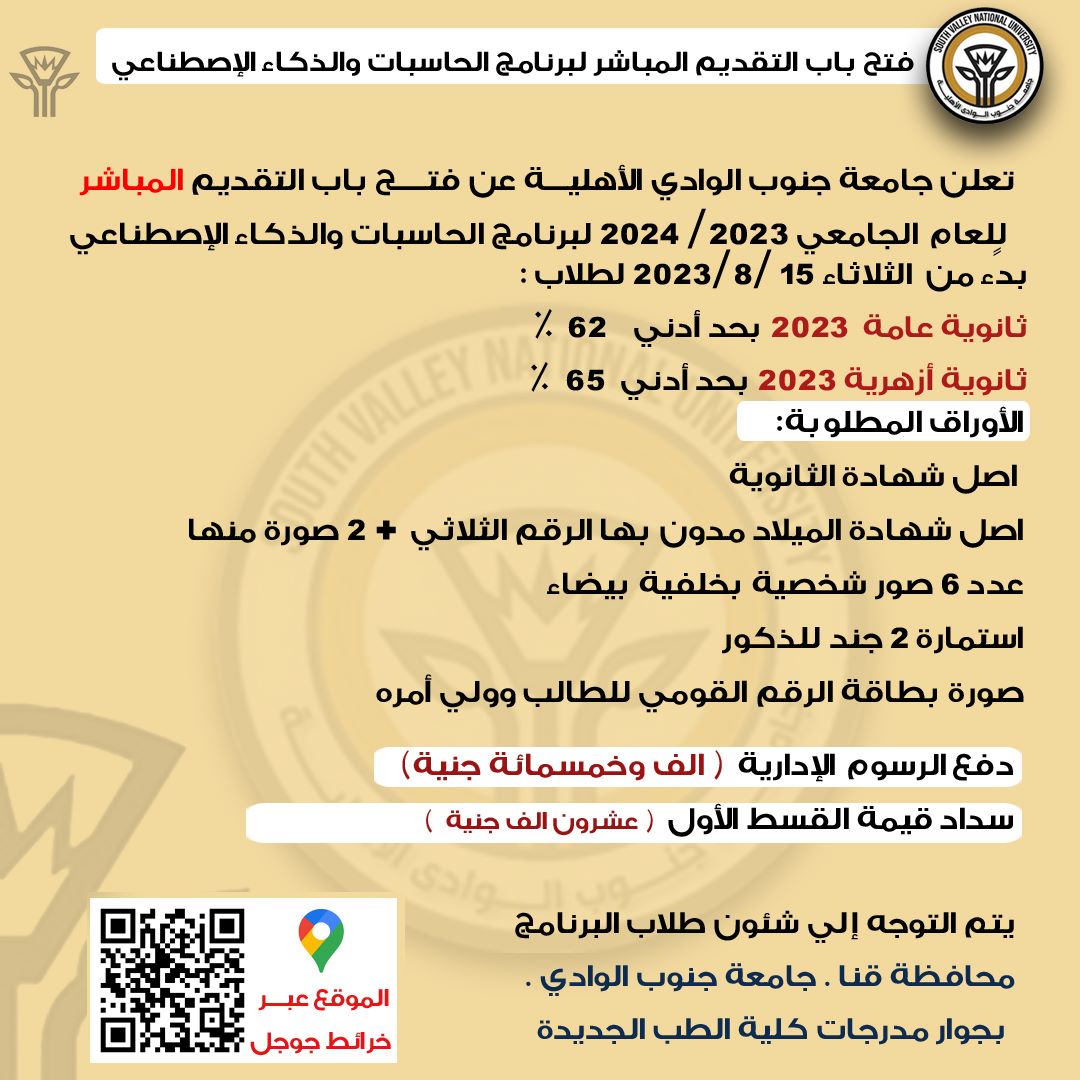 تعلن جامعة جنوب الوادي الأهلية عن فتح باب التقدم المباشر للعام الجامعي 2023/2024م لبرنامج الحاسبات والذكاء الاصطناعي اعتبارا اليوم الثلاثاء الموافق 15/8/2023 لطلاب الثانوية العامة والثانوية الأزهرية وفق الشروط الاتية:-