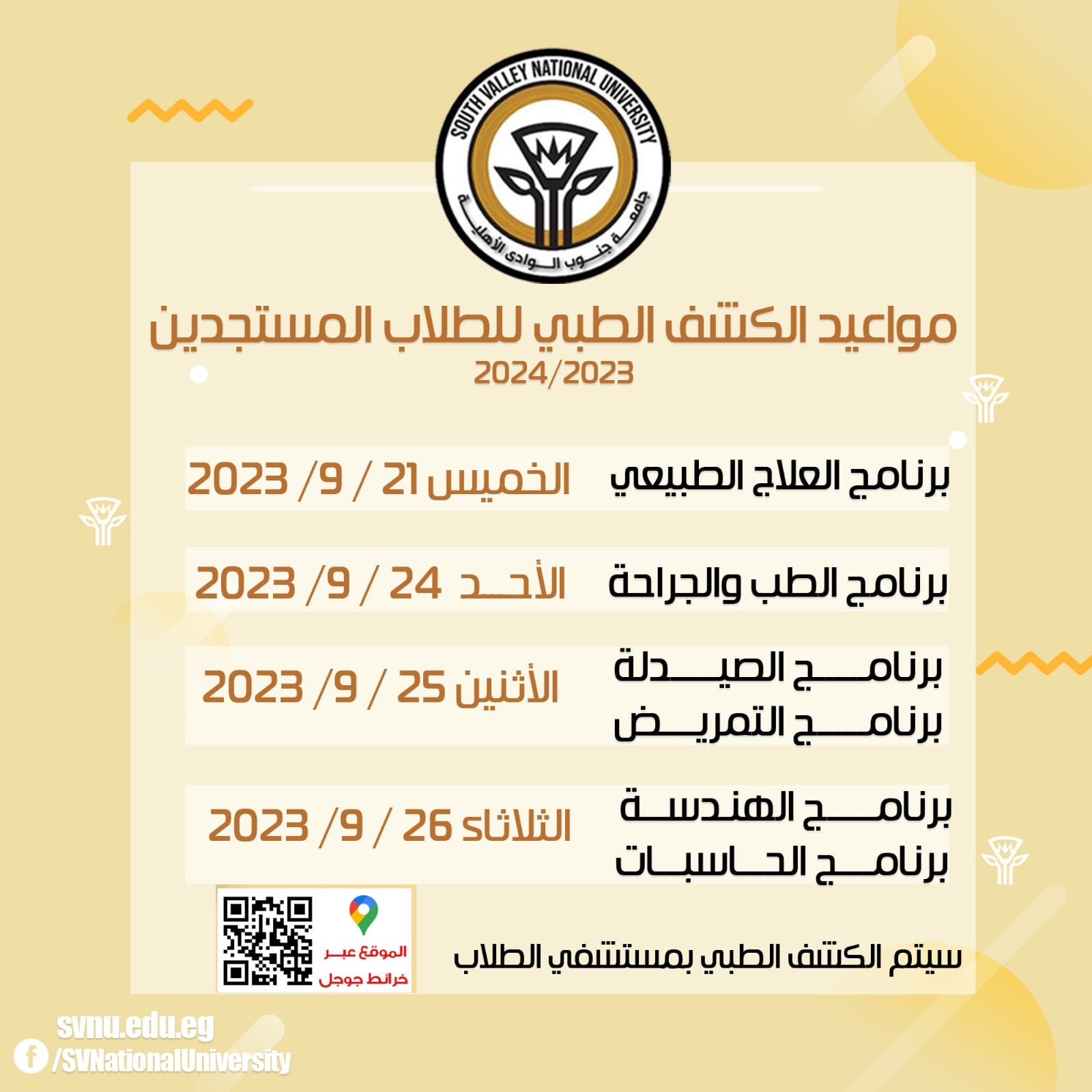 تعلن جامعة جنوب الوادي الأهلية عن مواعيد الكشف الطبي على الطلاب المستجدين بكافة البرامج اعتباراً من الخميس الموافق 21/9/2023م حتى الثلاثاء الموافق 26/9/2023م بمستشفى الطلاب حسب الجدول االمرفق: