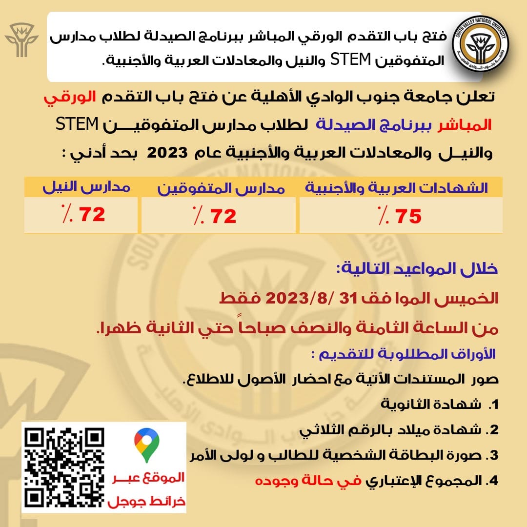 تعلن جامعة جنوب الوادي الأهلية عن فتح باب التقدم الورقي المباشر لمدارس المتفوقين والنيل والشهادات العربية والاجنبية ببرنامج الصيدلة يوم الخميس الموافق 31/8/2023م من الساعة الثامنة والنصف صباحاً وحتى الساعة الثانية ظهراً وفق الاشتراطات التالية:
