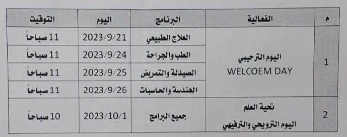 وتتضمن الفعاليات اليوم الترحيبي بالطلاب الجدد والقدامى والتعريف بالبرنامج الأكاديمي والرد على كافة الاستفسارات الأكاديمية بالاضافة بالتعرف على الأنشطة المختلفة التي تقدمها الجامعة وطرق الاشتراك بها وذلك حسب الجدول المرفق: