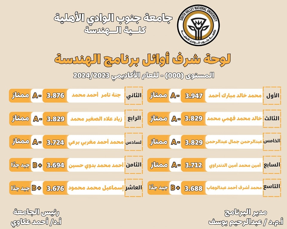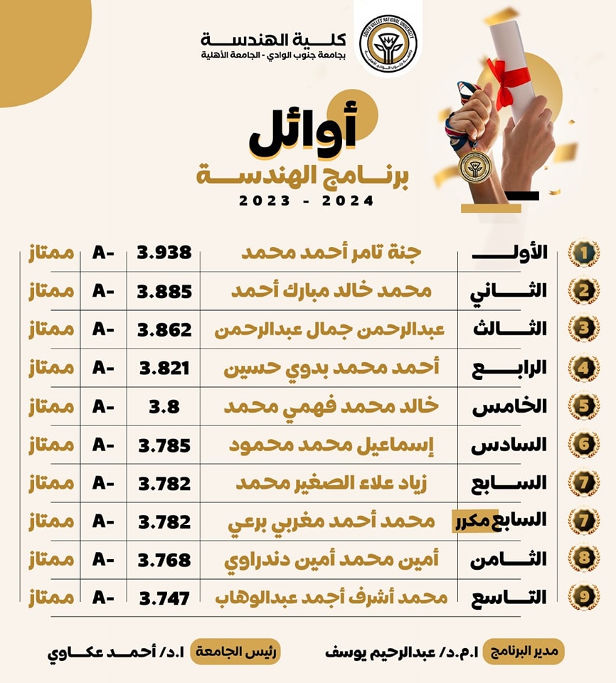 أوائل الفرقة الأولى ببرنامج الهندسة |