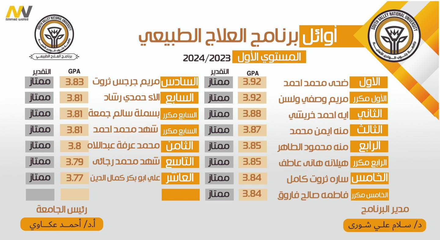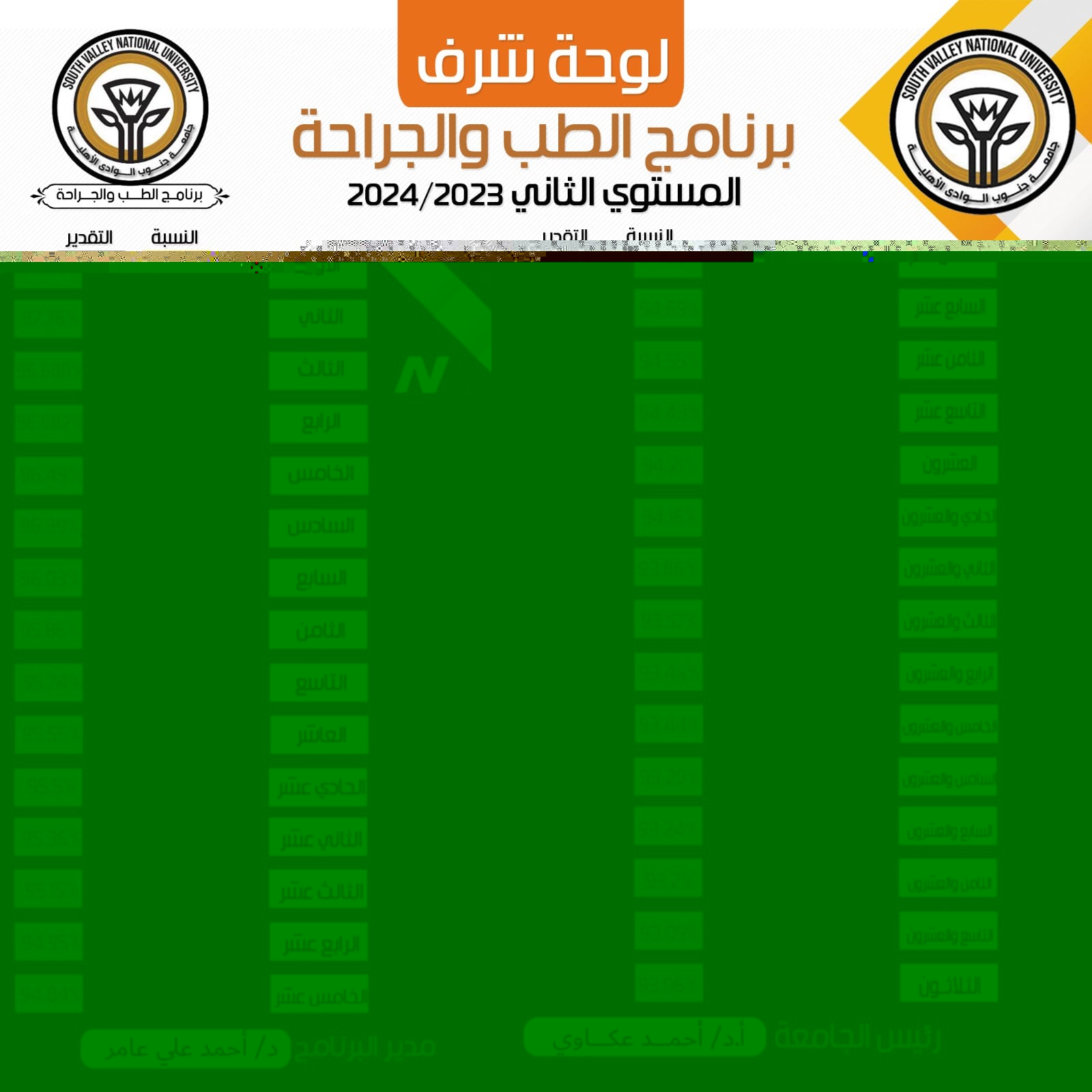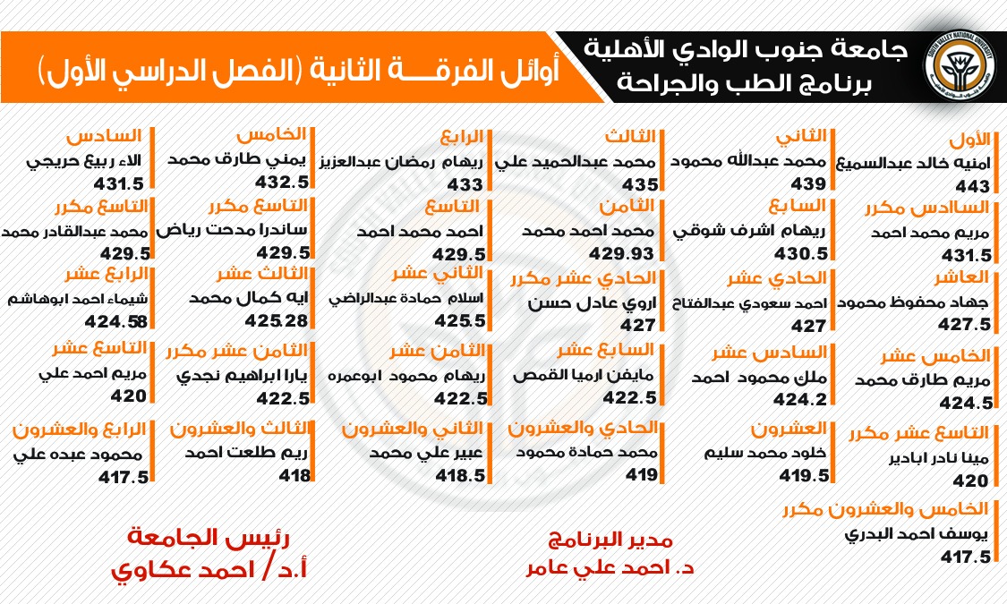 تتقدم جامعة جنوب الوادي الاهلية بأسمي ايات التبريكات والتهاني لابنائها الأوائل المتفوقين من برنامج الطب والجراحة (الفرقة الاولي) >>>> عرض |