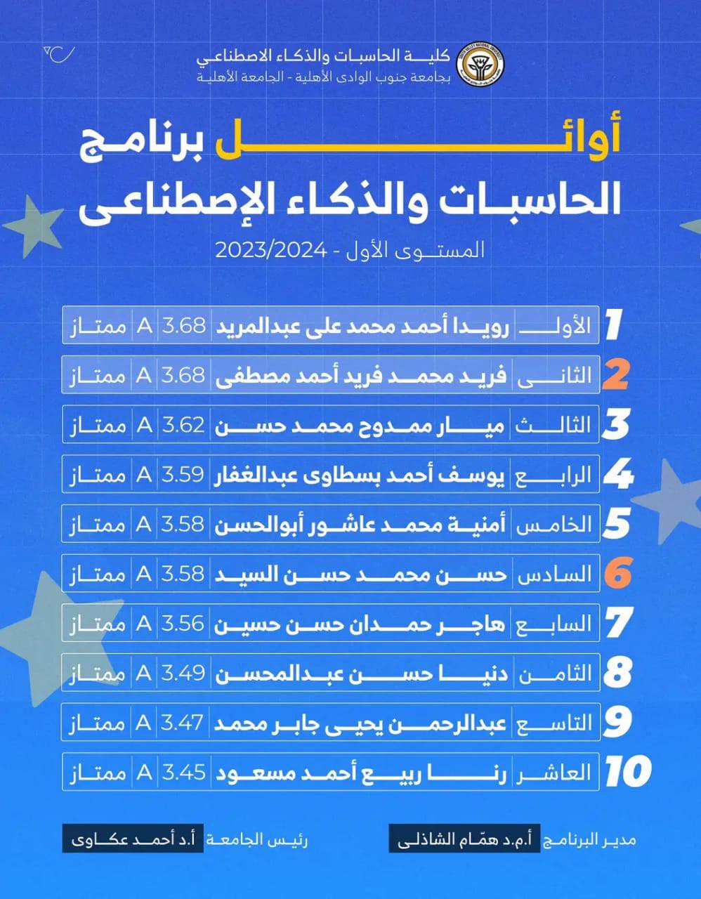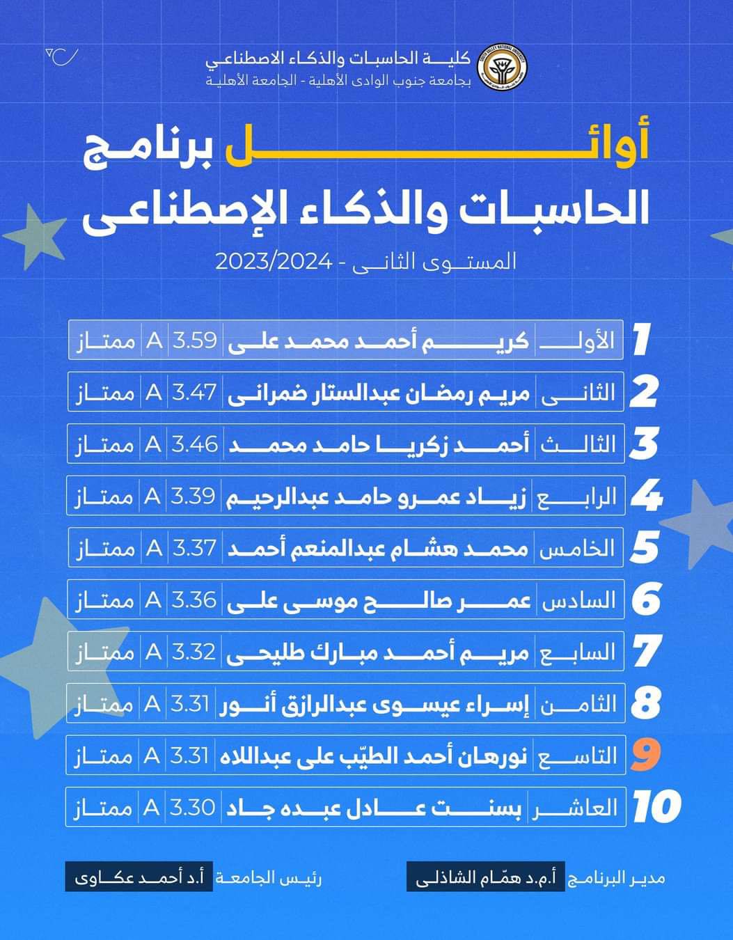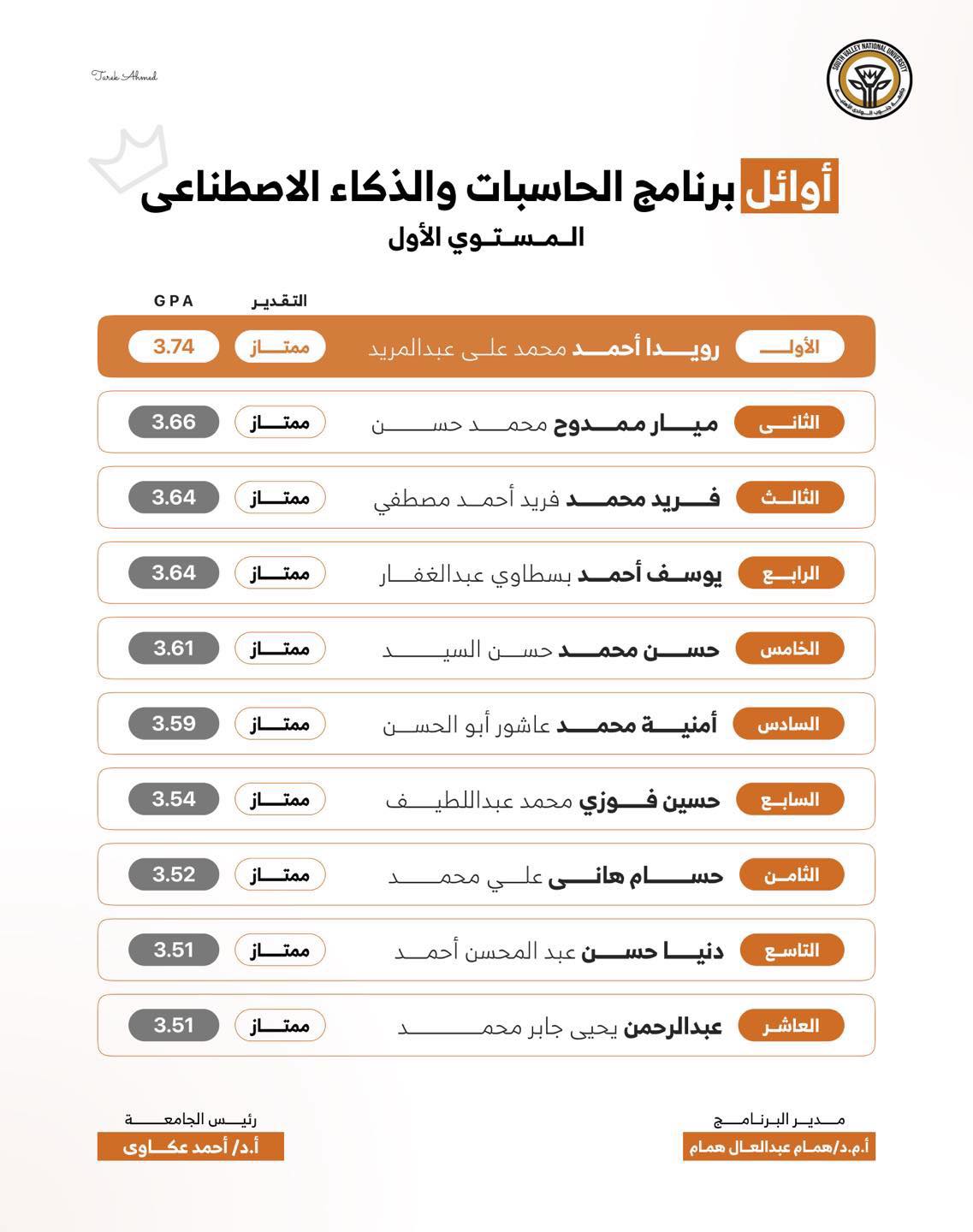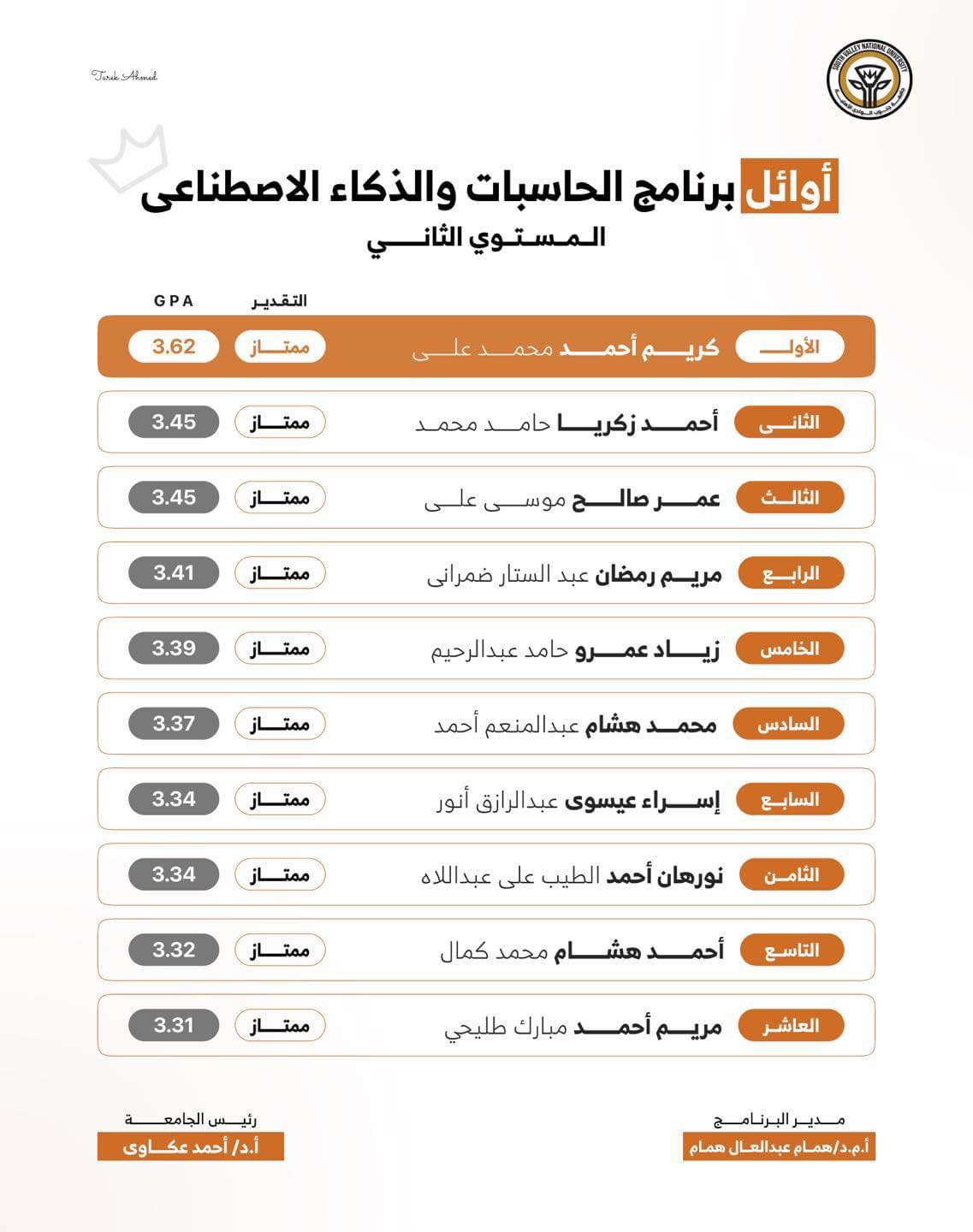 أوائل الفرقة الثانية ببرنامج الحاسبات و الذكاء الاصطناعي |