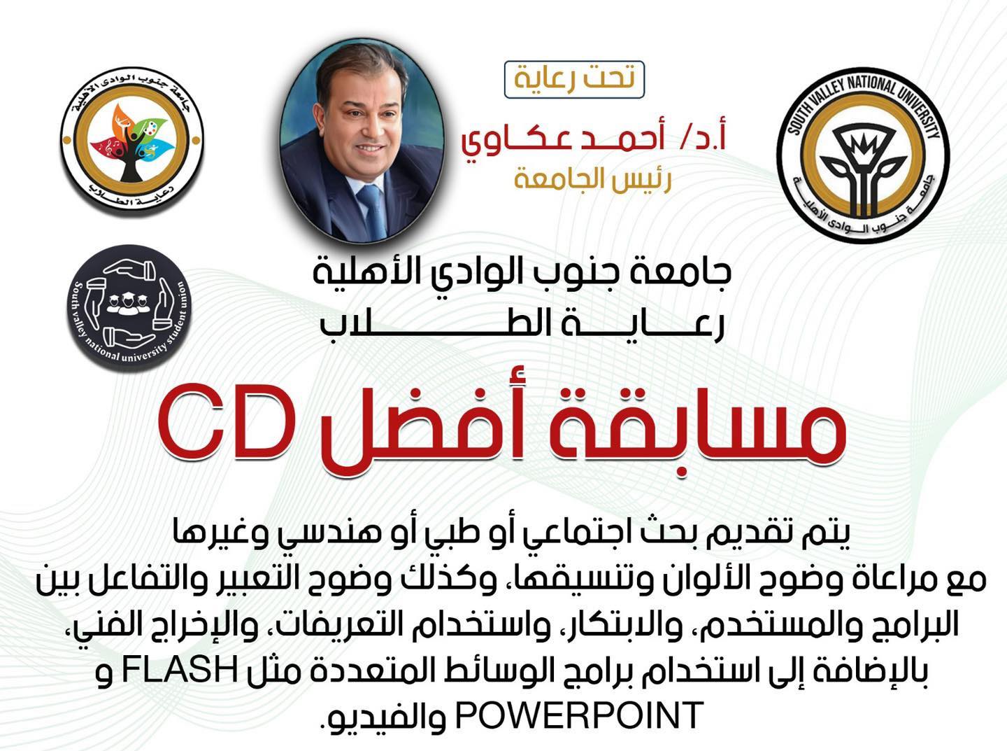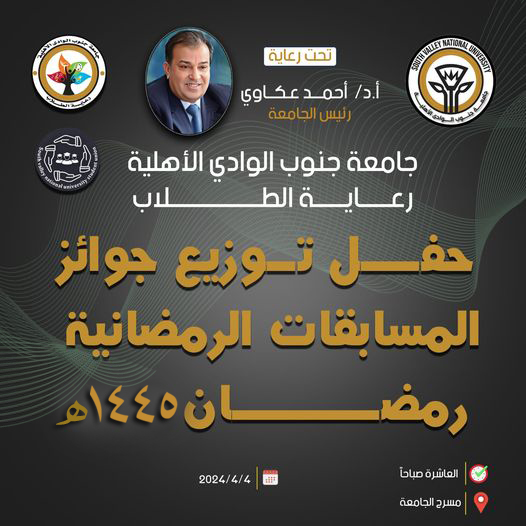 تحت رعاية الدكتور احمد عكاوى رئيس جامعة جنوب الوادي والدكتور محمد إسماعيل النائب الأكاديمى للجامعة و أشراف الدكتور احمد علي >>>> عرض |