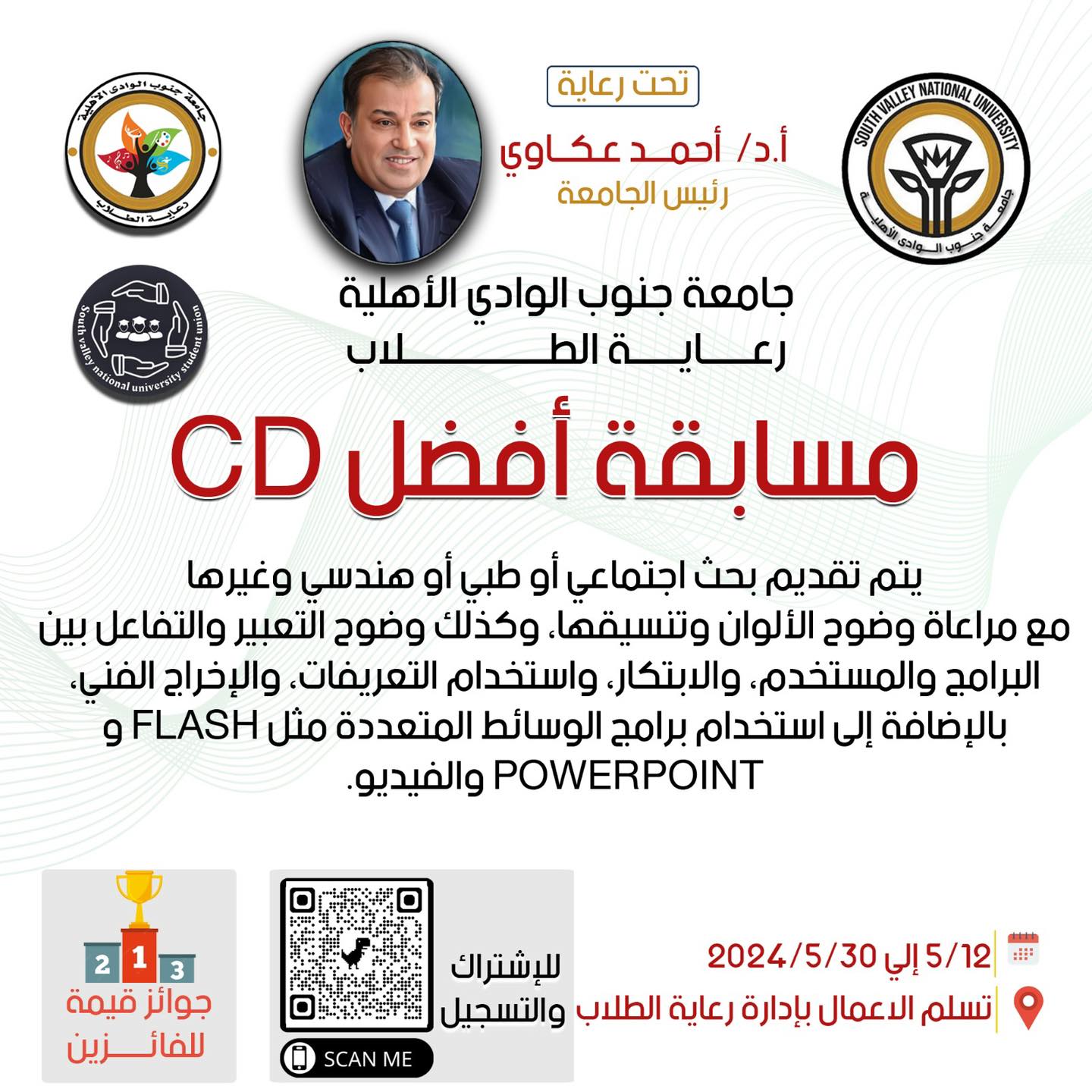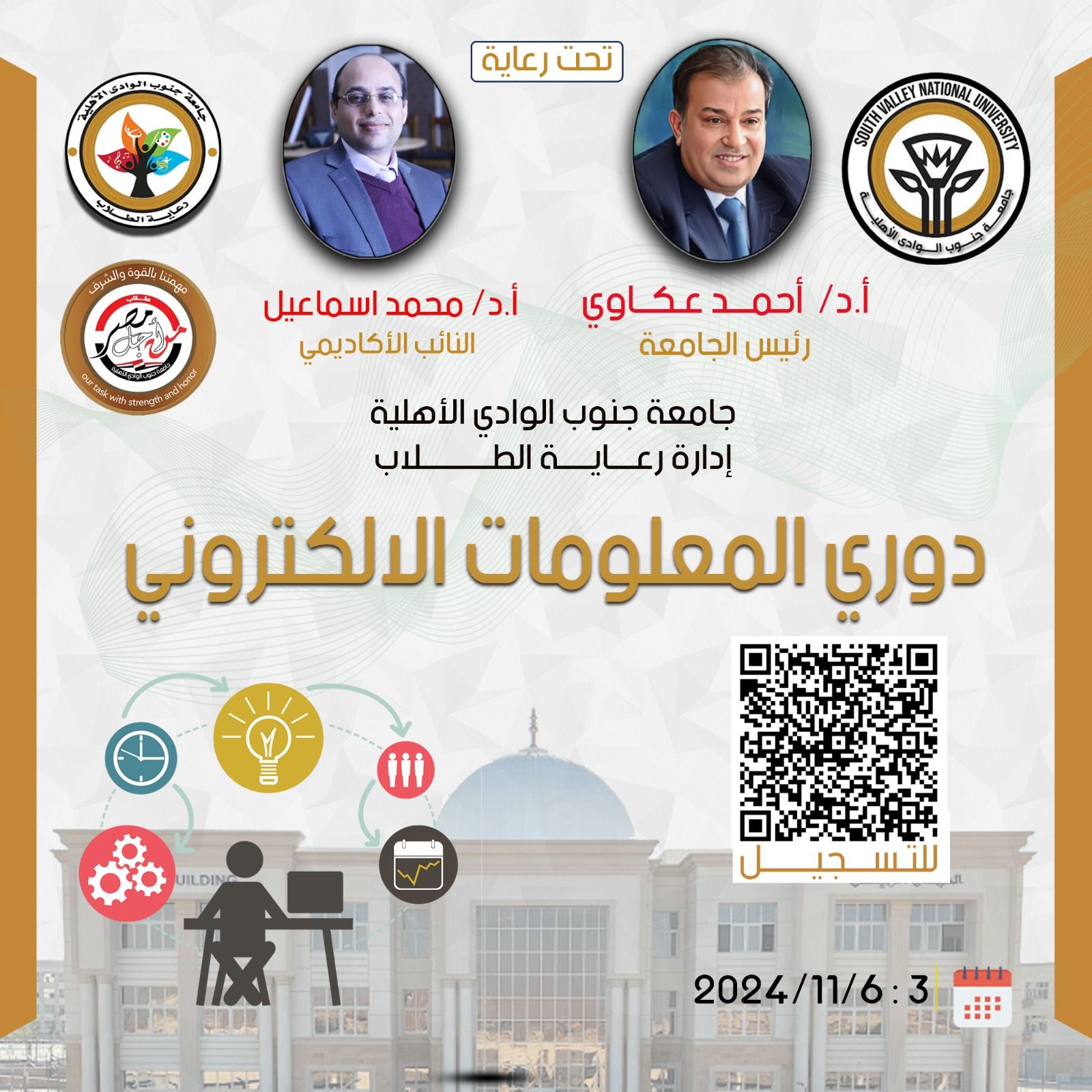 تحت رعاية الدكتور احمد عكاوي رئيس جامعة جنوب الوادي وباشراف الدكتور همام عبد العال همام مدير برنامج الحاسبات و الذكاء الاصطناعي >>>> عرض |