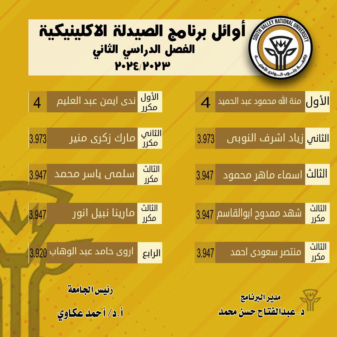 أوائل الفرقة الاولى ببرنامج الصيدلة بجنوب الوادي الأهلية |