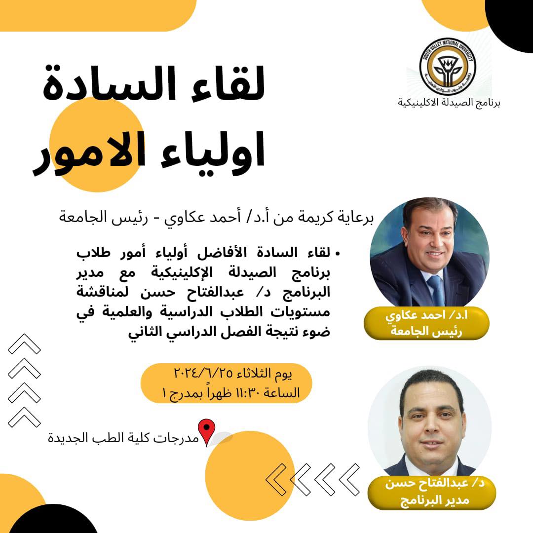 بتحت رعاية الدكتور أحمد عكاوى رئيس جامعة جنوب الوادي انتظام الدراسة العملية والنظرية ببرنامج الصيدله الإكلينيكية بجامعة جنوب الوادي الأهلية >>>> عرض |