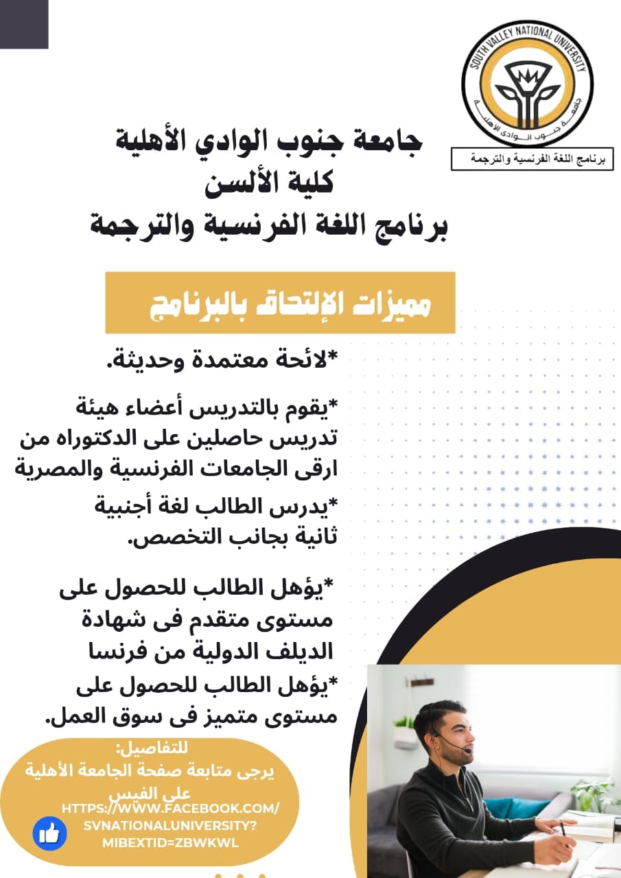 إنتظام الدراسة ببرنامج اللغة الفرنسية والترجمة بكلية الألسن بجامعة جنوب الوادي الأهلية |
