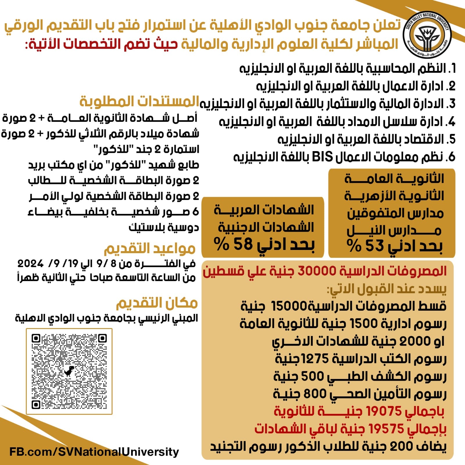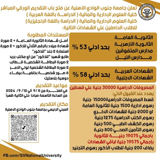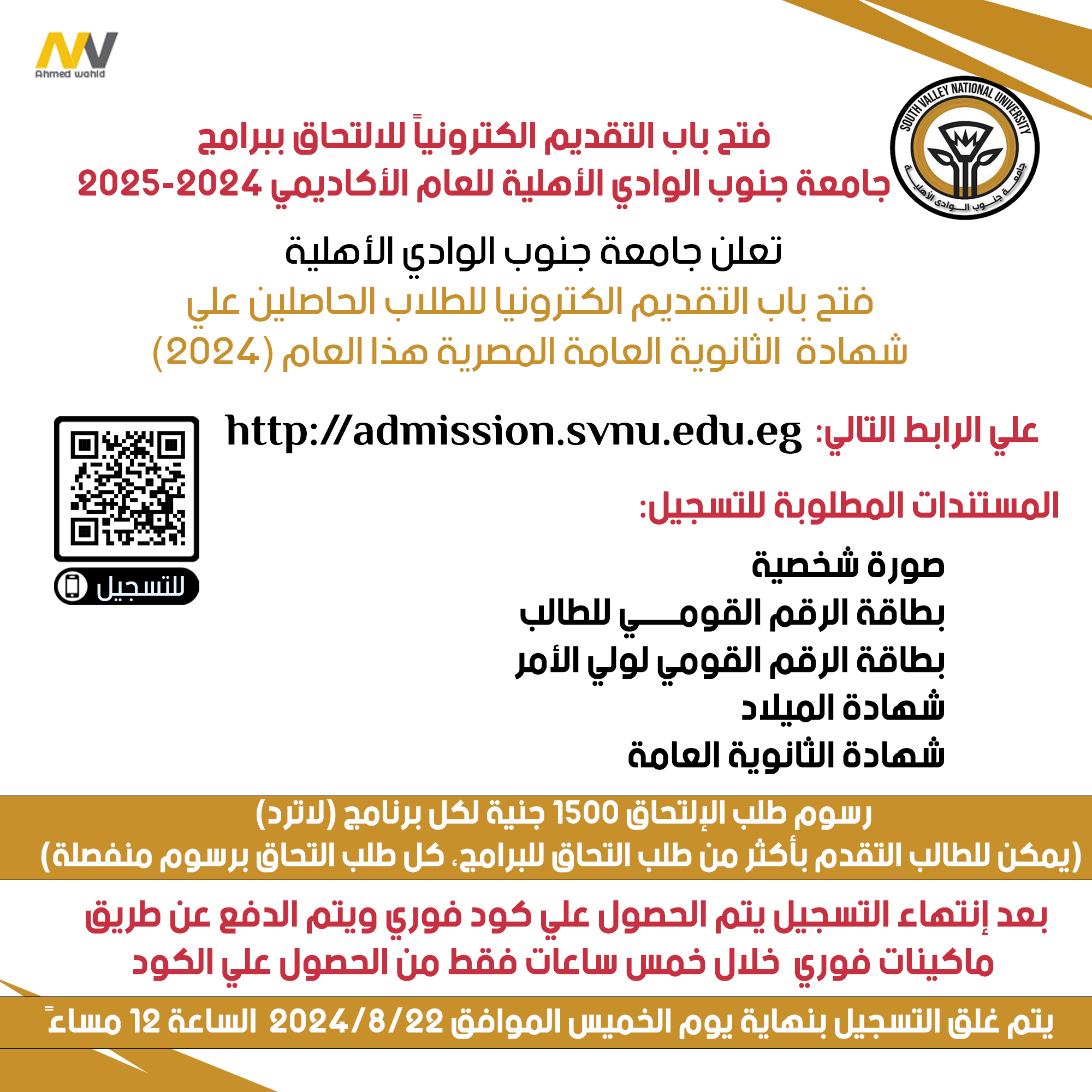 جنوب الوادى الاهلية تقرر غلق باب القبول فى جميع البرامج للعام الجامعي 24-25 |