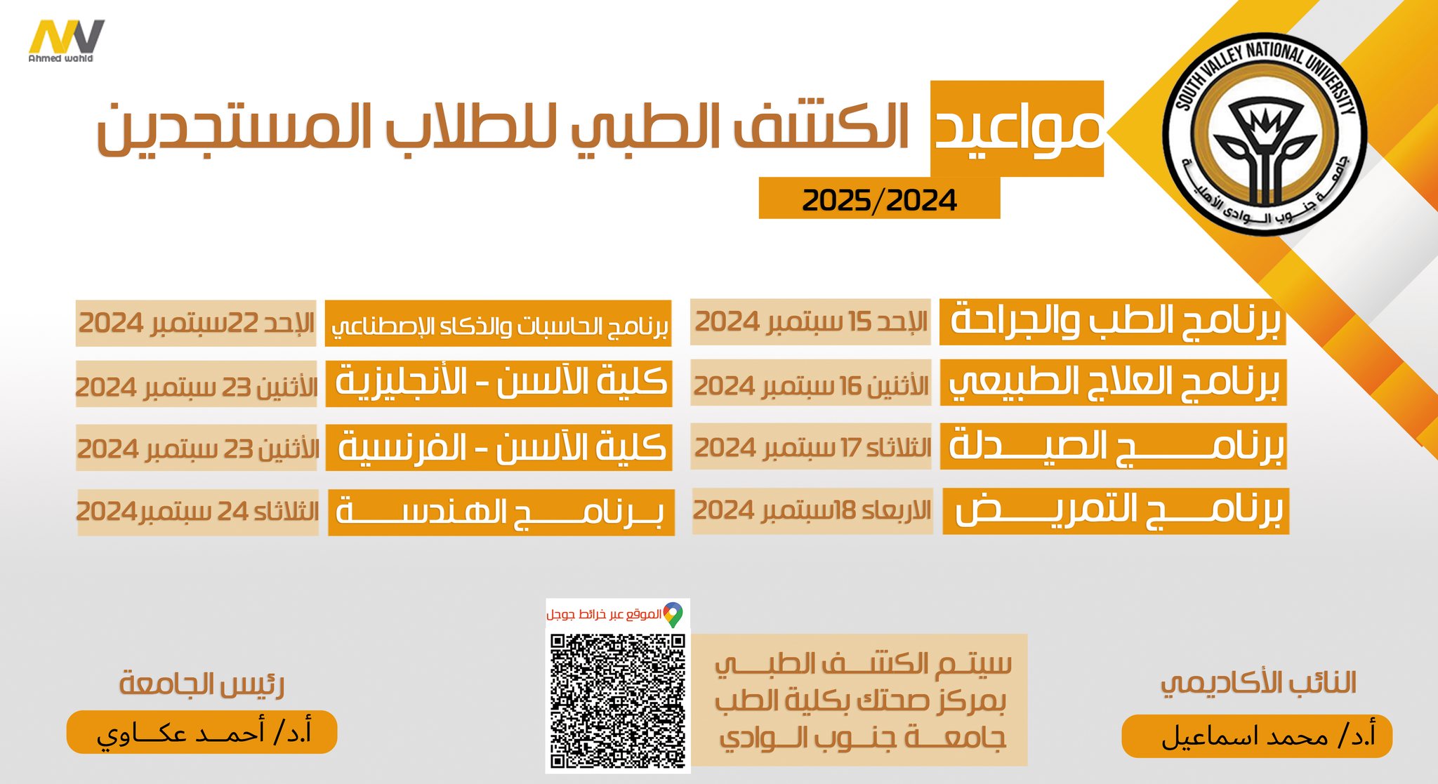 بدأ تحت رعاية الدكتور أحمد عكاوي رئيس جامعة جنوب الوادي الكشف الطبي للطلاب الجدد المقبولين ببرامج جامعة جنوب الوادي >>>> عرض |
